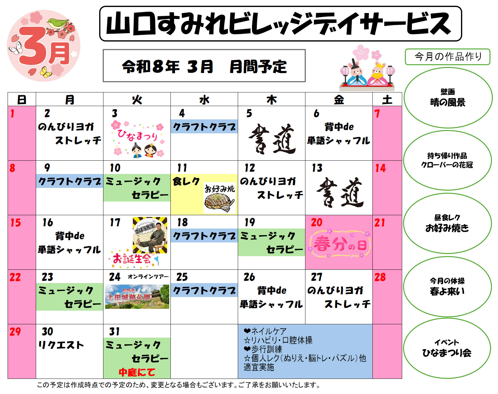 3月のデイサービス予定表を更新しました。